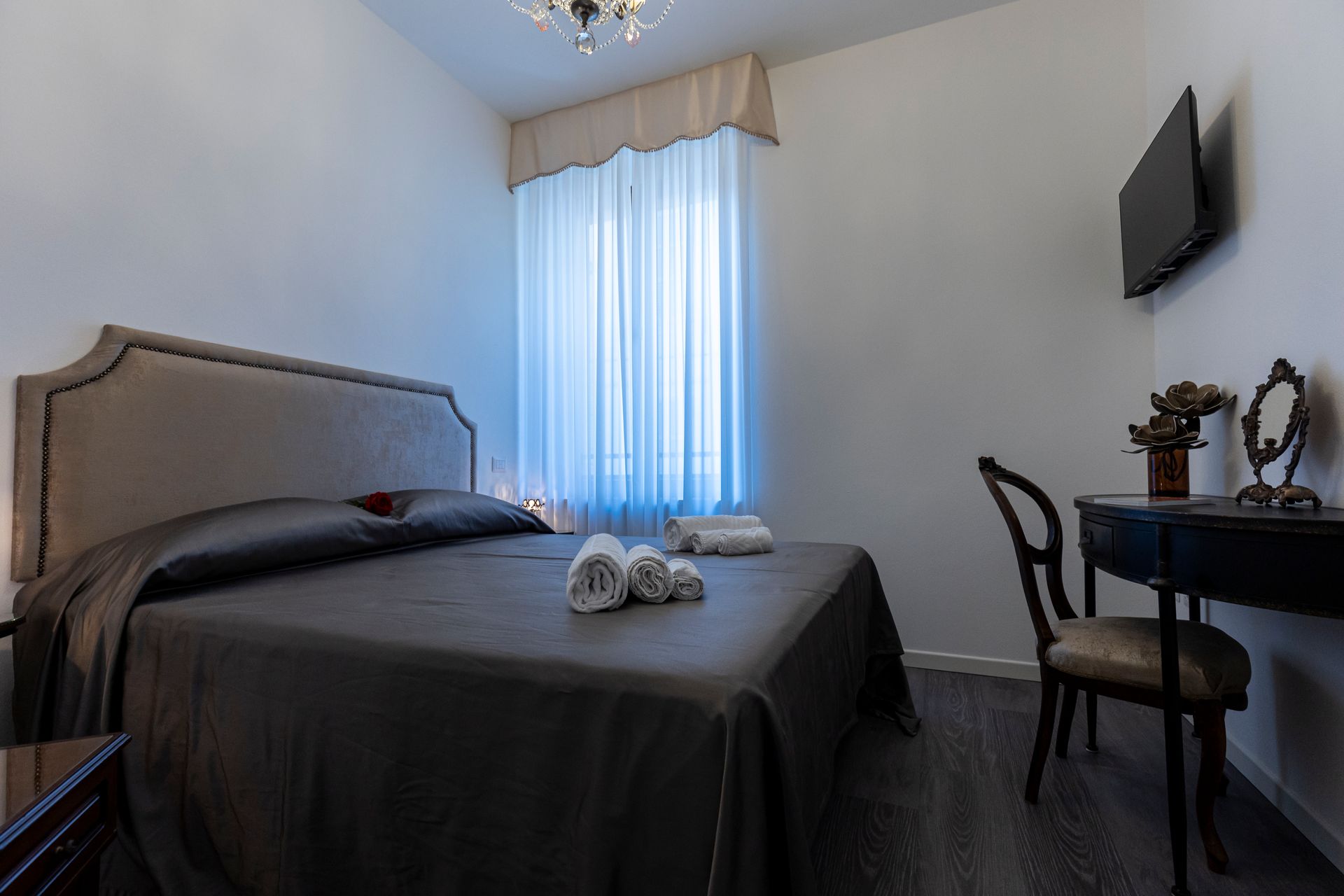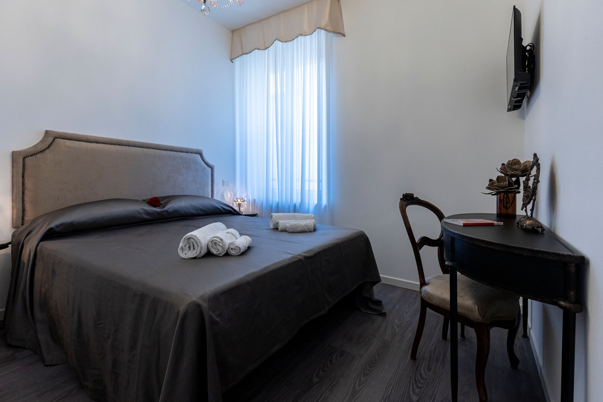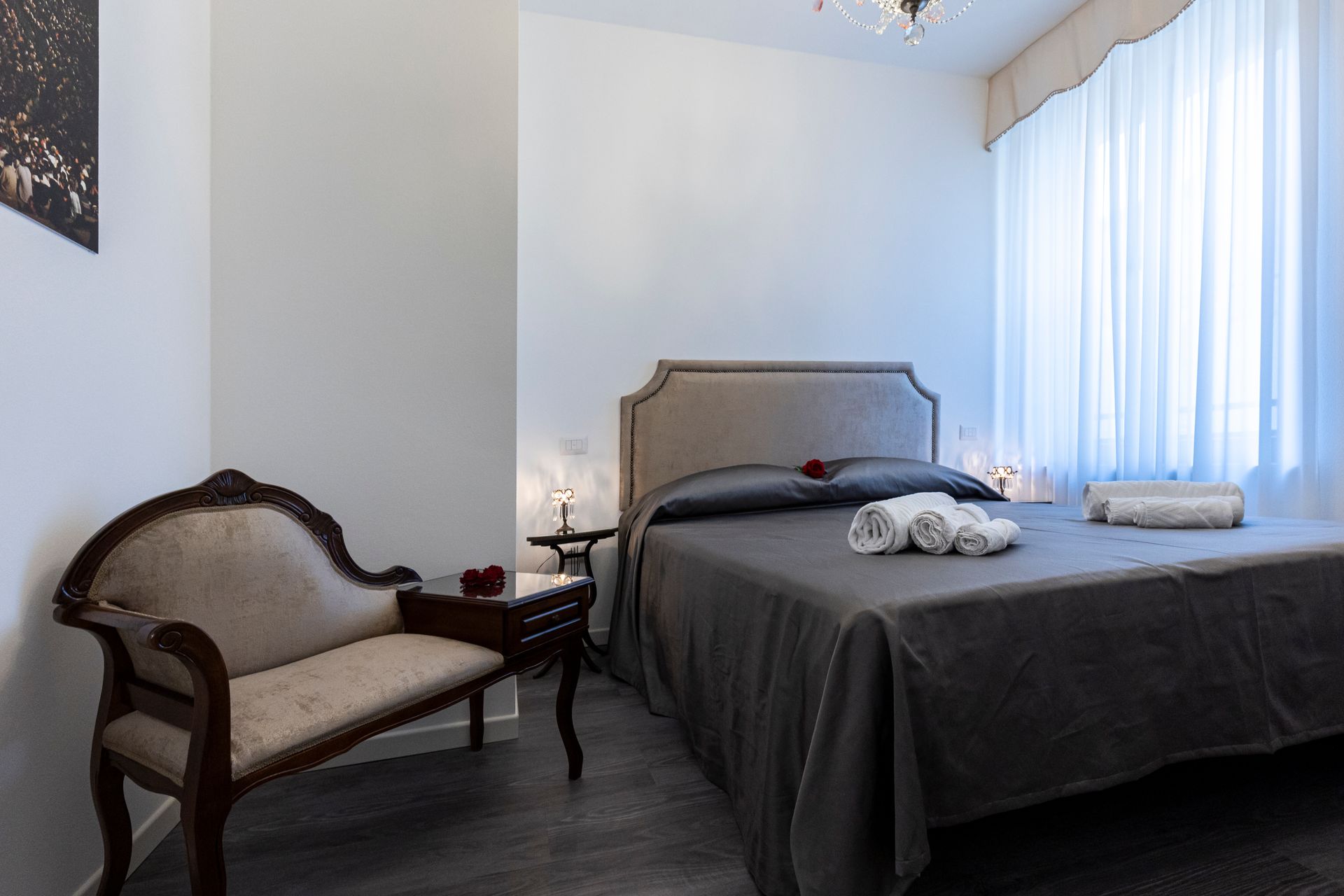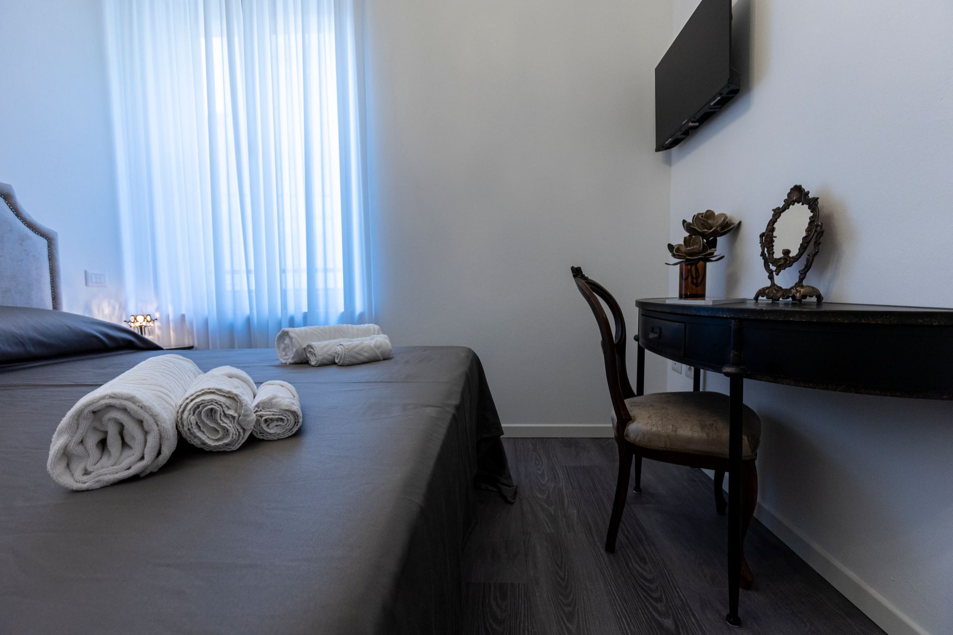 Camera matrimoniale dotata di aria condizionata, pareti insonorizzate, balcone con vista sulla città e bagno privato con doccia.