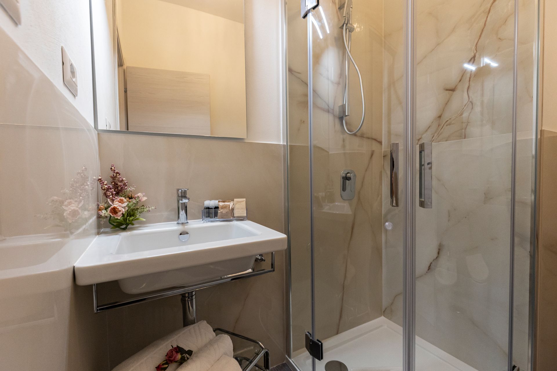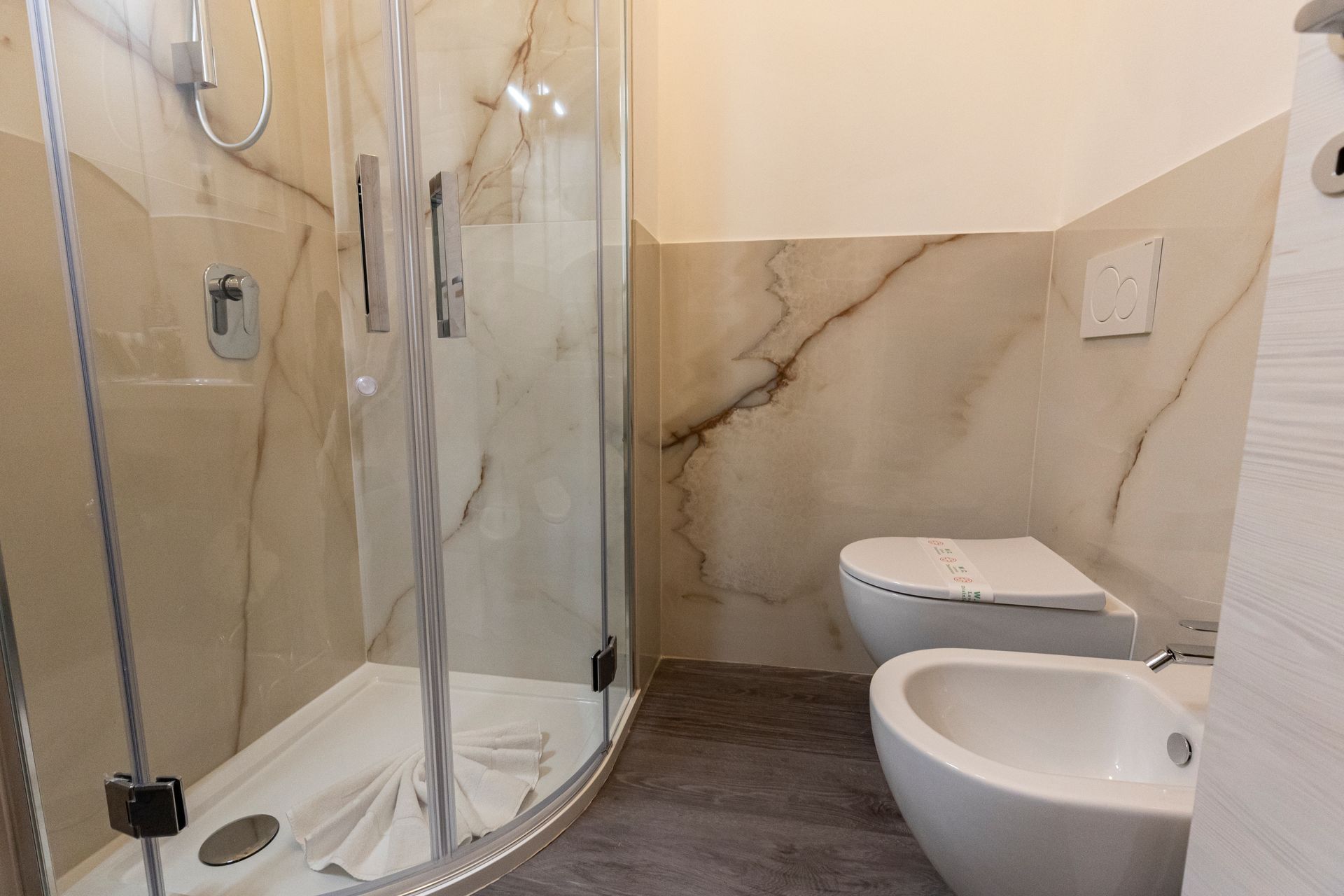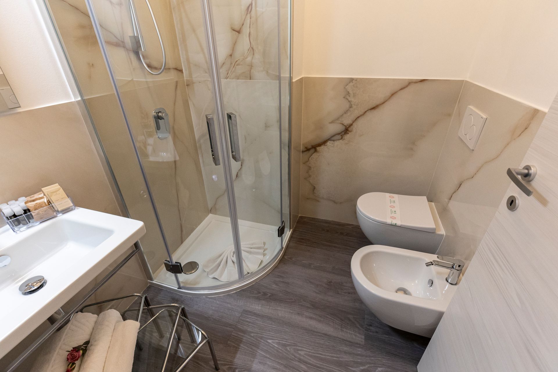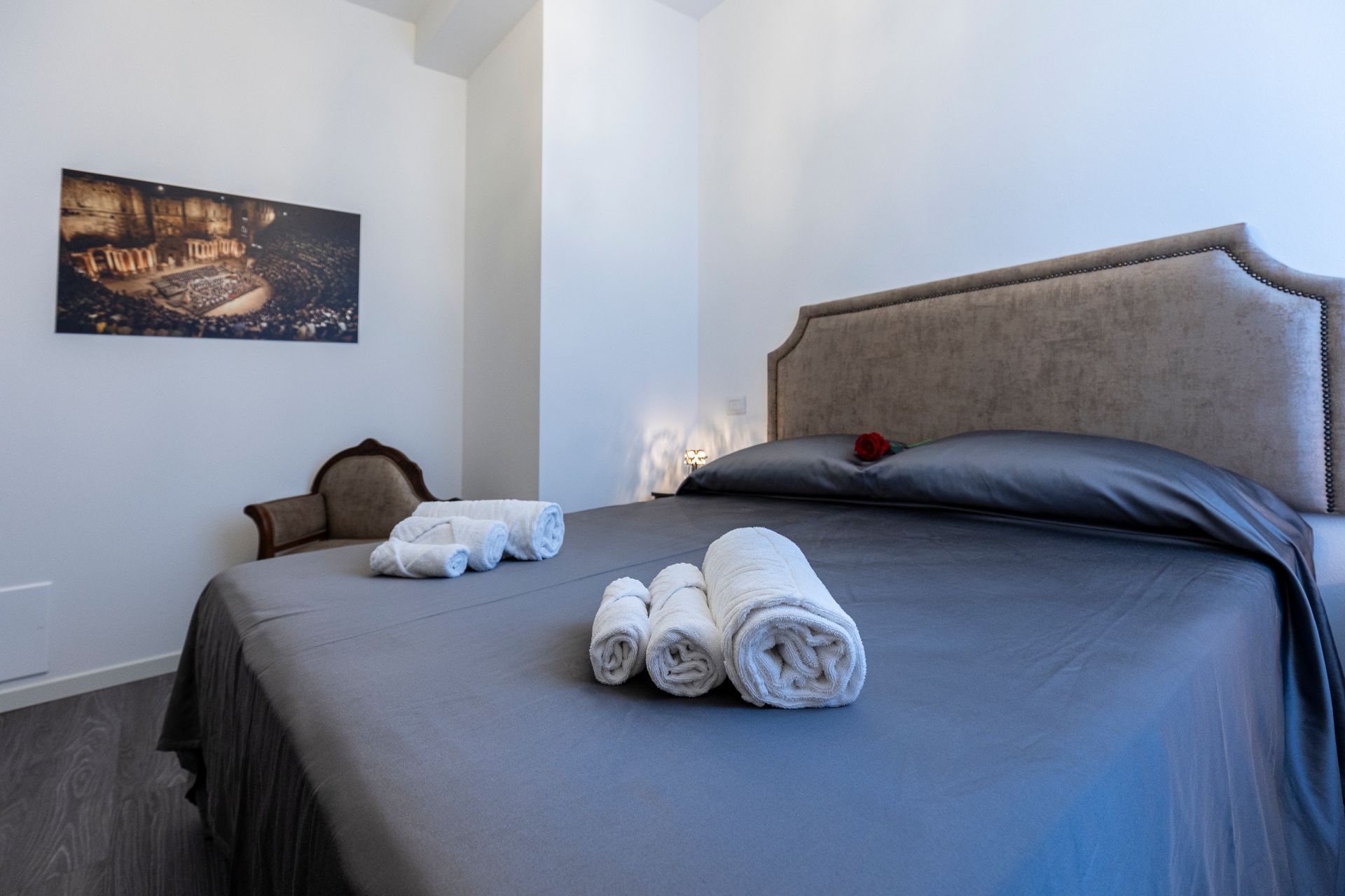 Camera matrimoniale dotata di aria condizionata, pareti insonorizzate, balcone con vista sulla città e bagno privato con doccia.